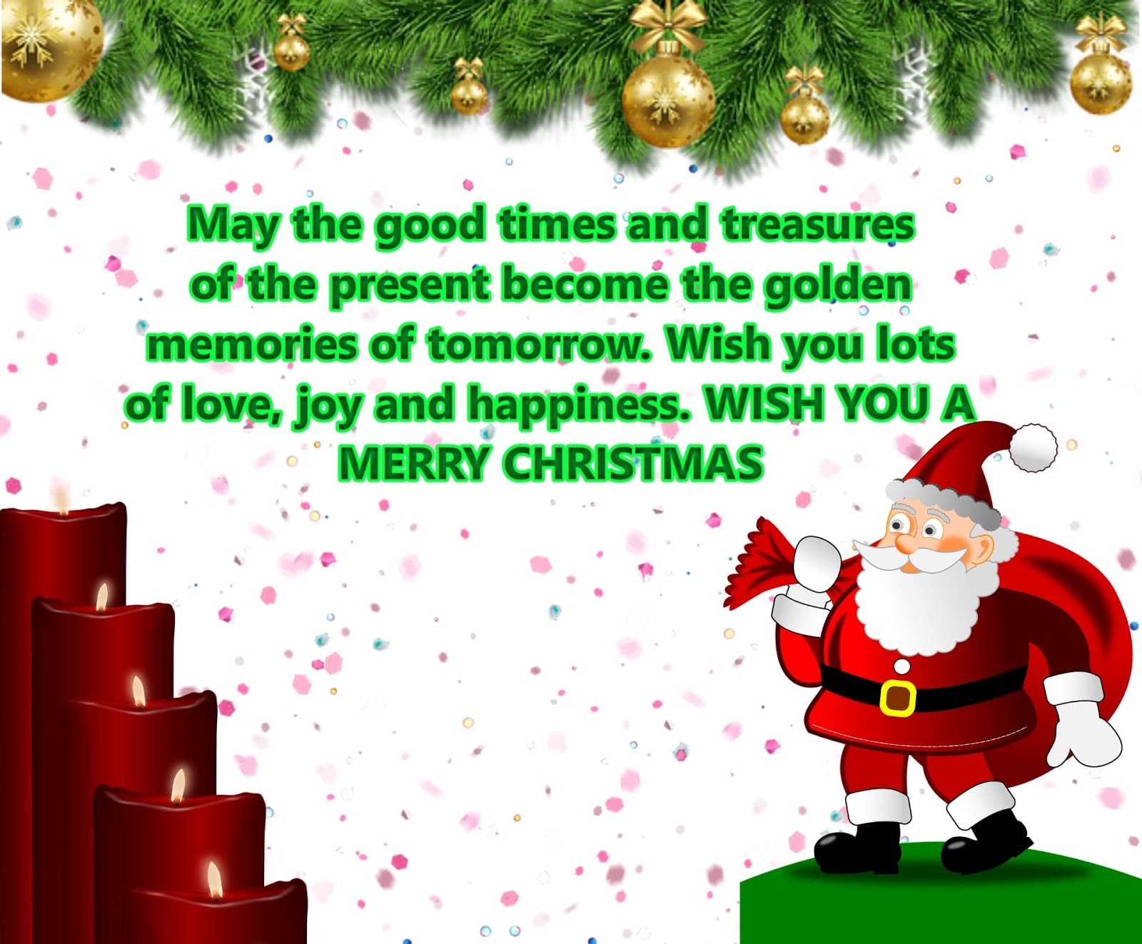 - 🎉May the good times🎉 and treasures of the present become the golden memories of tomorrow❤😇. Wish you lots of love❤, joy and happiness🎉. Wish you a Merry Merry Christmas🎉🎄.